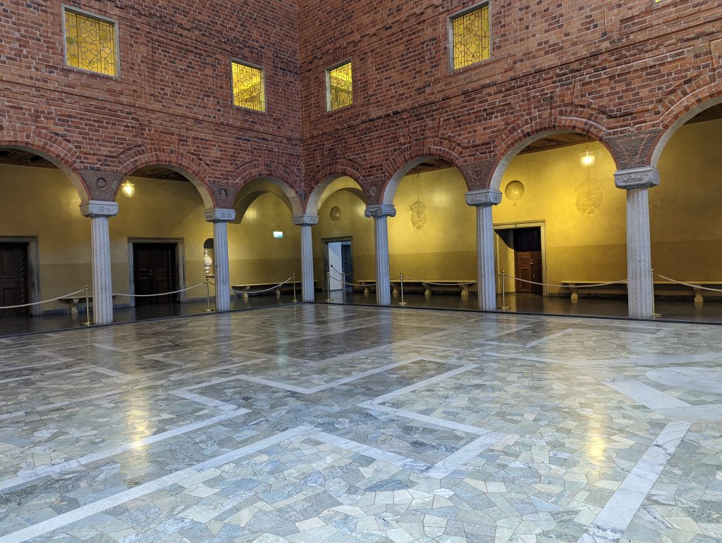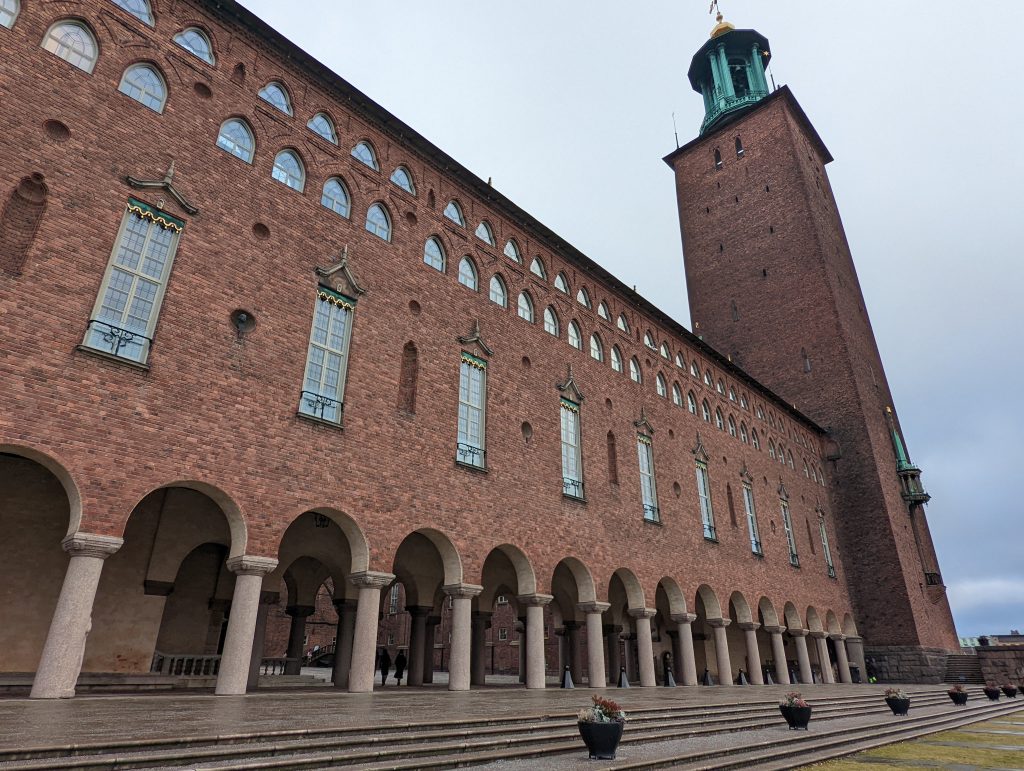 <これからストックホルムを観光しましょう。ノーベル賞受賞会場の市庁舎へ行きます。今日のホテルは空港にあるホテルです>。