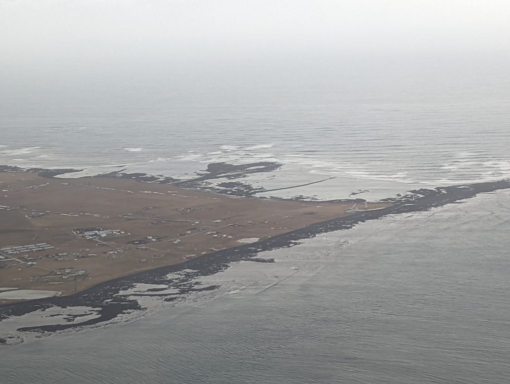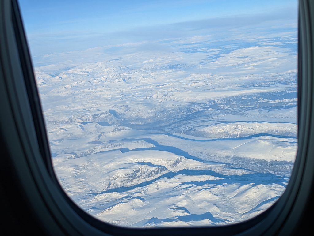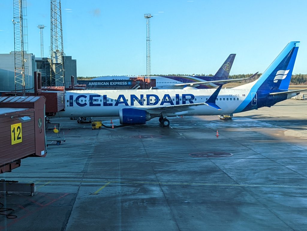 翌朝、ストックホルムは曇り。飛ぶかな~と思いながら空港へ。飛ぶみたい、皆んなの席も確保できました。スエーデン、ノルウェー上空、海上に出て三時間半後、アイスランド首都のレイキャブィクに着陸。