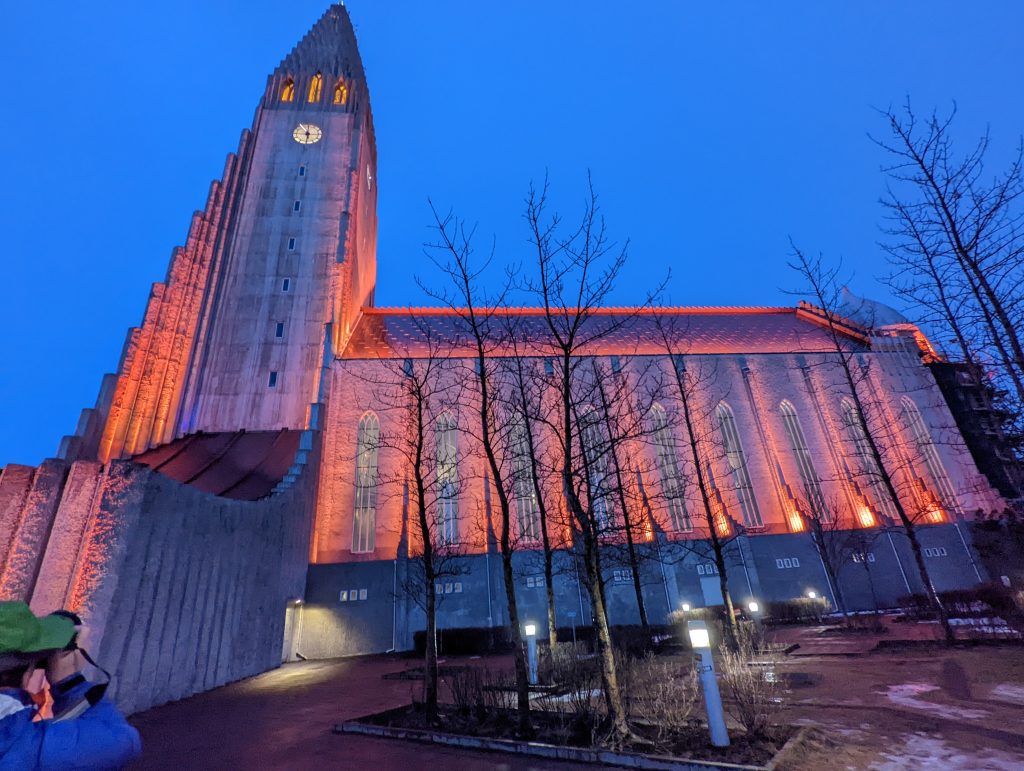 空港から海辺沿いを通ってホテルへ、既に薄暗い。夕飯まで市内観光。小さな町に大きな教会。風か吹いて雪と雨の洗礼を受ける。夕飯はお好みではなかった。