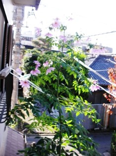 屋根まで伸び華やかな花を咲かしています。